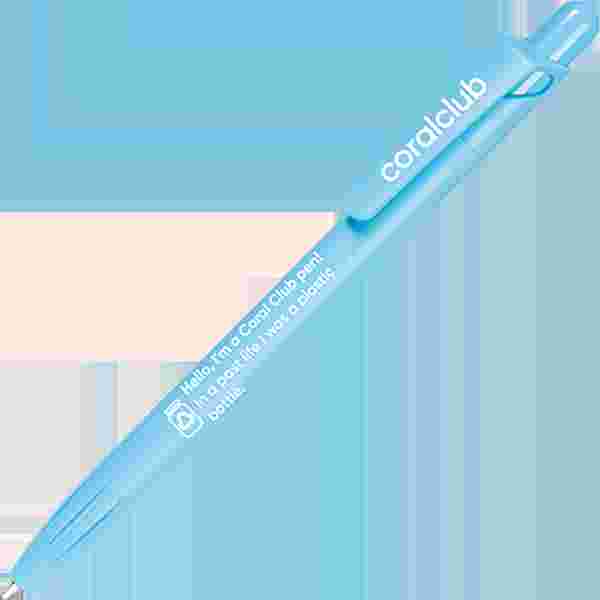 Lodīšu pildspalva ar spiedpogas mehānismu, kas ir izgatavota no PET-RECYCLED materiāla ar uzrakstu "Labdien, es esmu Coral Club pildspalva! Iepriekšējā dzīvē es biju plastmasas bundža".